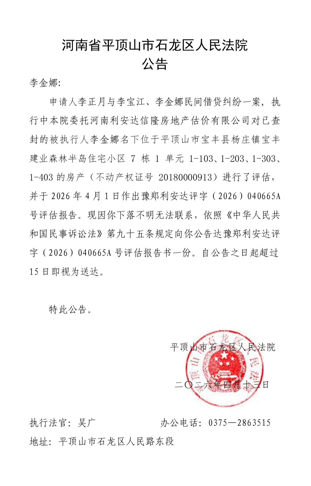 河南省平顶山市石龙区人民法院公告